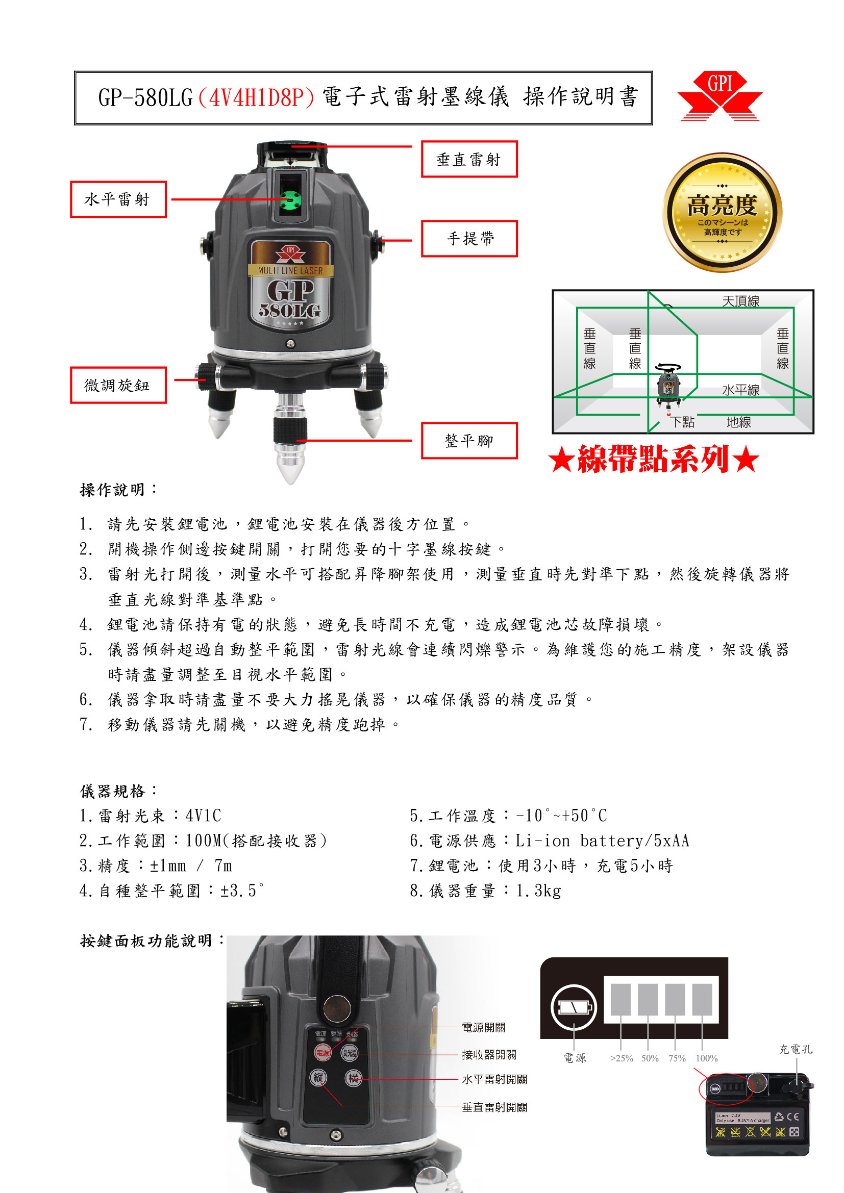 ◎ 高亮度綠光4垂直+360°水平